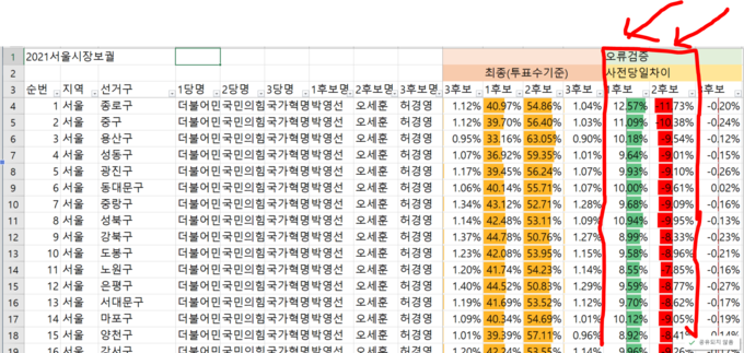 예를 들어, 종로구의 경우 박영선 후보와 오세훈 후보는 각각 +12.57%와 -11.73%이다.