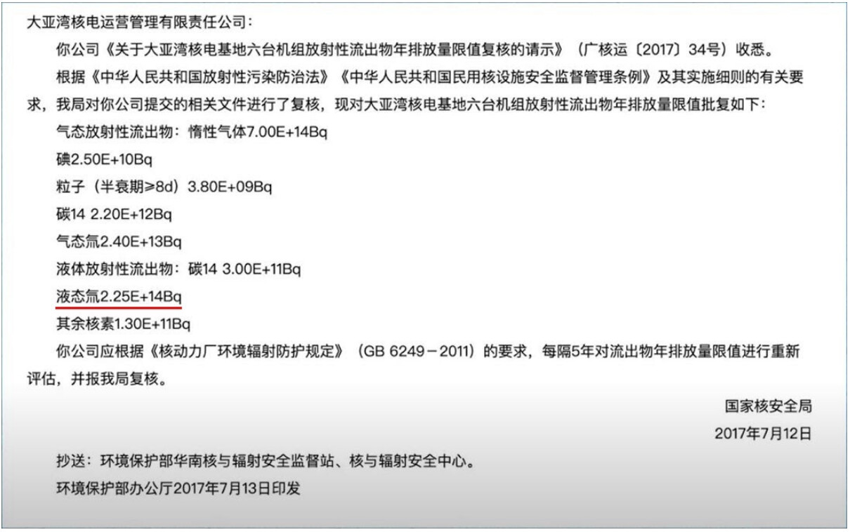 2017년 중공 생태환경부가 승인한 다야만 원전 관련 문서. 액상 트리튬(液態氚) 방류량 225조 베크렐(연간)로 표시돼 있다