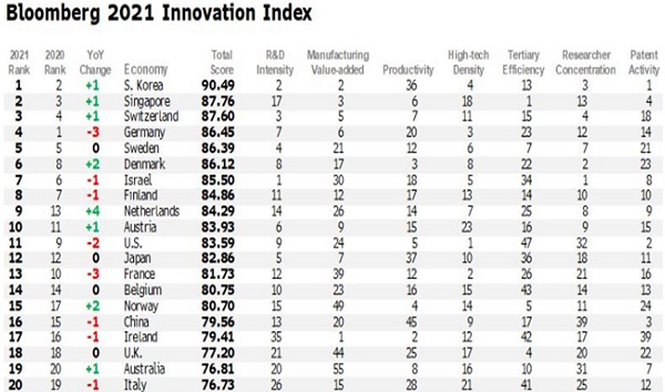2위 싱가포르, 3위 스위스, 4위 독일, 5위 스웨덴, 6위 덴마크, 7위 이스라엘, 8위 핀란드, 9위 네델란드, 10위 오스트리아, 11위 미국, 12위 일본, 13위 프랑스, 16위 중국, 18위 영국, 19위 호주, 20위 이탈리아.