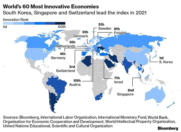 지난 2월 초에 발표한 블룸버그 국가 혁신지수에 의하면 한국이 세계 1위라 한다.