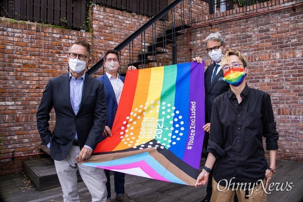 서울퀴어문화축제 조직위원장 홀릭(맨 오른쪽)과 축제를 지지했던 북유럽의 (오른쪽 두 번째 부터) 야콥 할그렌 스웨덴 대사, 피터 뱅스보 덴마크 대사관 이노베이션 센터장, 빼까 메쪼 핀란드 대사가 "코펜하겐 2021"의 공식 레인보우 깃발을 함께 들었다.