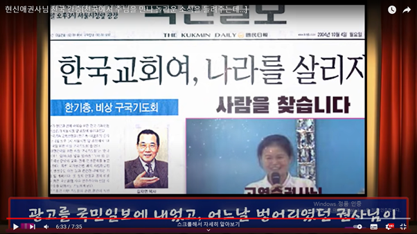 간증 1-3에서 51분 7초 지점에서, 죽었다 입신해서 천국에서 주님을 만나고 책망을 받고 세상으로 돌아왔던 (죽었다 깨어났다) 현신애 권사가 (신유 사역으로 유명했던 분) 찾아 (국민일보에 광고) 고영순 권사를 만난 이야기가 나온다.
