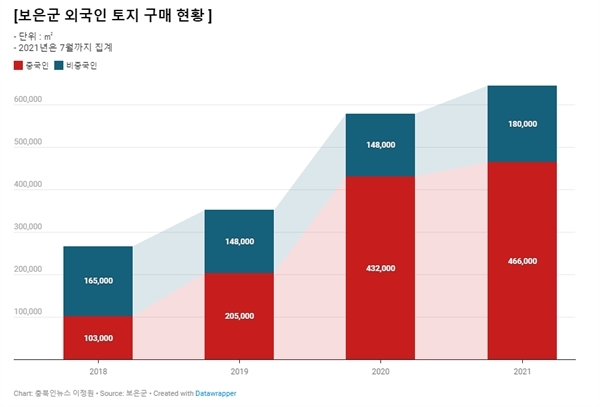 보은군은 이날 보도자료를 통해 2018년부터 2021년 7월 말까지 보은지역 외국인 토지 매입현황을 공개했다. 자료에 따르면 보은군 외국인 소유 토지는 2018년 27만㎡였던 것이 2019년에는 35만㎡, 2020년에는 58만㎡, 2021년에는 64만㎡로 꾸준히 증가하고 있다.