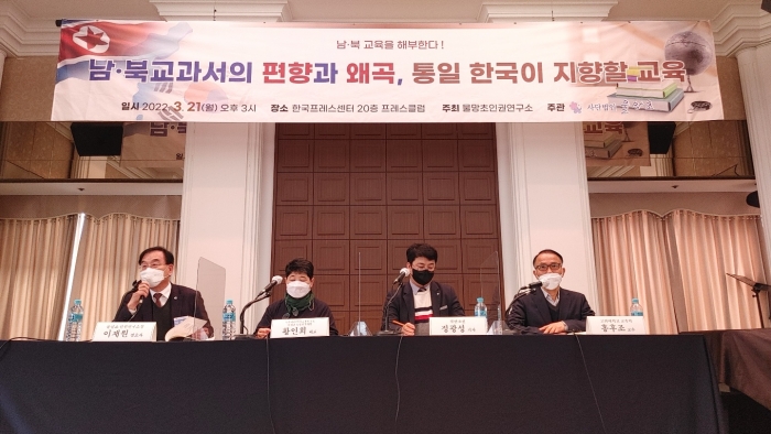 3월 21일 오후 서울 중구 프레스센터 20층에서 남·북 교육을 해부하는 세미나가 열렸다. 사단법인 물망초 주최로 열린 세미나는 ‘남북 교과서 편향과 왜곡, 그리고 통일 한국이 지향할 교육’을 주제로 진행됐다.