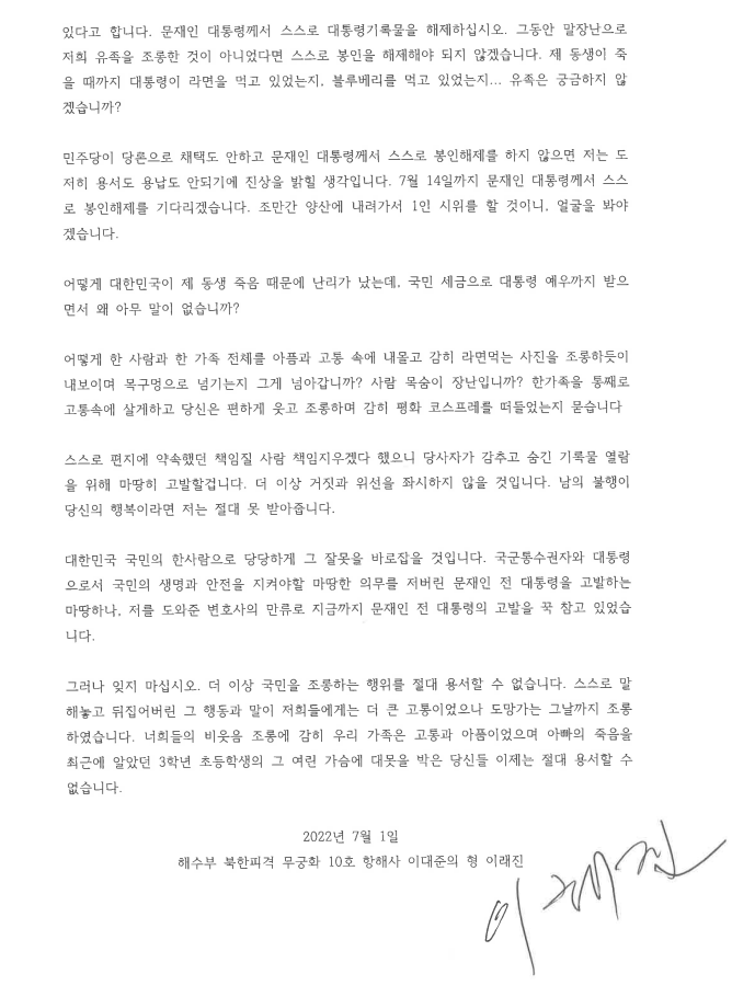 육성으로 준비한 글을 읽어 나간 이 씨는 "2020년 9월22일은 대한민국 해수부 공무원 이대준이 북한군에 무참히 총격으로 사살돼 불태워진 만행으로 국민의 주권과 인권이 대한민국에서 사라진 날"이었다고 했다. 이어 "문 대통령은 저희 가족과 국민들에게 국민의 생명과 재산을 보호하는 임무를 다한다는 약속을 했으나, 청와대는 약속과 달리 한 공무원의 개인적 일탈행위로 월북 프레임을 씌웠다"면서 "퇴임 후에는 대통령기록물로 관리해 30년간 누구도 볼 수 없게 했다"고 지적했다.