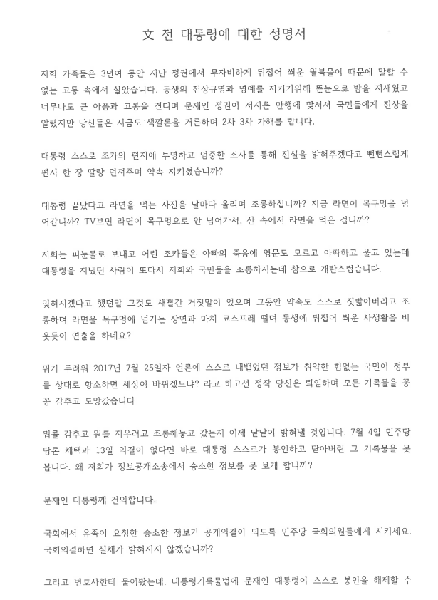 그는 "대궐같은 집에 수십명의 경호원들이 지키는 귀하에게 약속이행 촉구를 위한 천리길을 마다 않고 내려와 외침에도 두 귀와 두 눈을 감고 무슨 생각을 하고 있냐"고 반문했다. 그러면서 "무슨 이유로 사살했고, 죽였는지. 어떤 사유와 근거로 월북자로 발표했는지 그것만 알면 된다"며 "문 대통령은 국민 앞에 봉인된 진실의 문을 스스로 열어 논란의 잠재워야 할 것"이라고 목소리를 높였다.