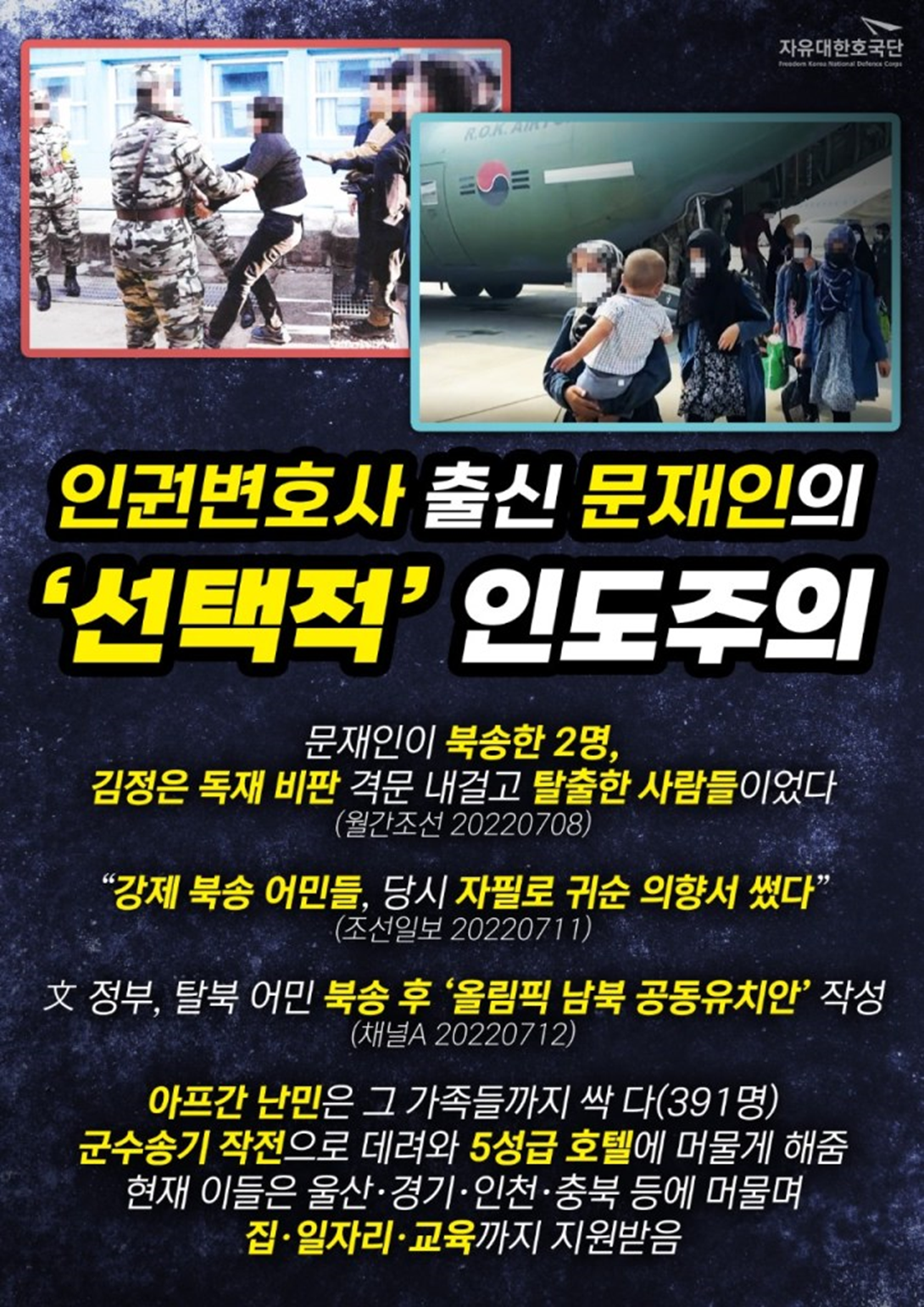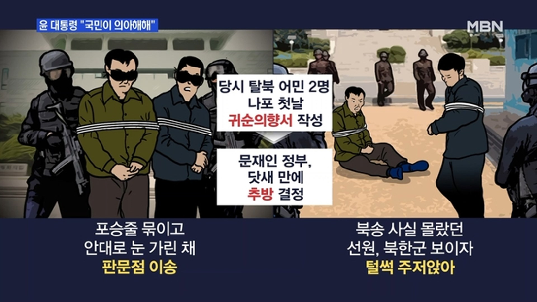 북한으로 가지 않으려고 발버둥치는 두 탈북자들의 얼굴을 가리고, 두 손을 묶고 무술 유단자들이 양편에서 팔목을 잡고 강제로 판문점 통해 북송시켜 사지로 내 몰아 버린 이 살인자가 바로 문재인이었다.