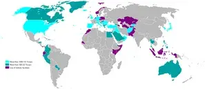 미군 해외 주둔국들 (도표에서 검게 된 부분은 복사 과정에서 오류가 발생한 것으로, 국기 부분이다)