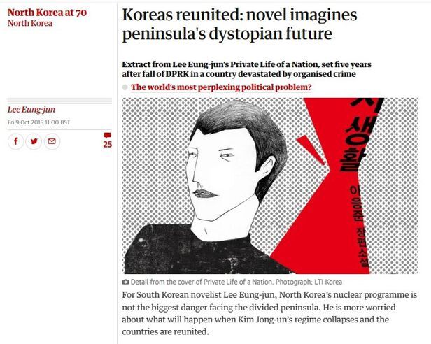 이응준 작가의 장편소설 <국가의 사생활(Private Life of a Nation)>을 조명한 영국 일간신문 '가디언(Guardian)'의 2015년 10월 9일자 기사. 소설 내 200자 원고지 32매에 해당하는 2개 장(章)을 발췌번역해 실었다./인터넷 캡처