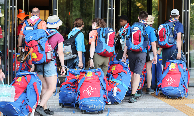2023 새만금 세계 스카우트 잼버리에서 조기 퇴영한 영국 스카우트 대원들이 지난 5일 경기도 성남시의 한 호텔에 도착하고 있다. 연합뉴스
