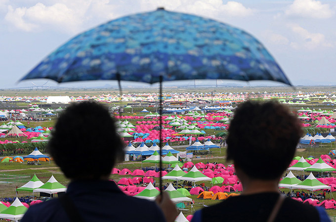 지난 4일 시민들이 전남 부안군 잼버리공원에서 '2023 새만금 제25회 세계스카우트잼버리' 숙영지를 바라보고 있다. 부산=뉴시스 이양승 군산대 무역학과 교수는 지난 5일 자신의 페이스북을 통해 “문제는 전라도의 독재 정치로부터 왔다. 몇 번 지적했지만 전라도는 민주주의라는 외침만 있는 상황”이라며 “잼버리를 준비한다고 하지만 모두가 같은 정견을 갖고 있는 사람들만 모여서 일을 한다고 해보자. 쇄신안을 내기 어렵다”고 말했다.
