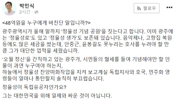 ‘오월 정신’을 간직하고 있는 광주가, 시민들의 혈세를 들여 기념해야만 할 인물이 과연 누구여야 하는지, 하늘에서 정율성 찬양미화작업을 지켜 보고계실 독립지사와 호국, 민주화 영령들이 얼마나 통탄할지 솔직히 부끄럽습니다.