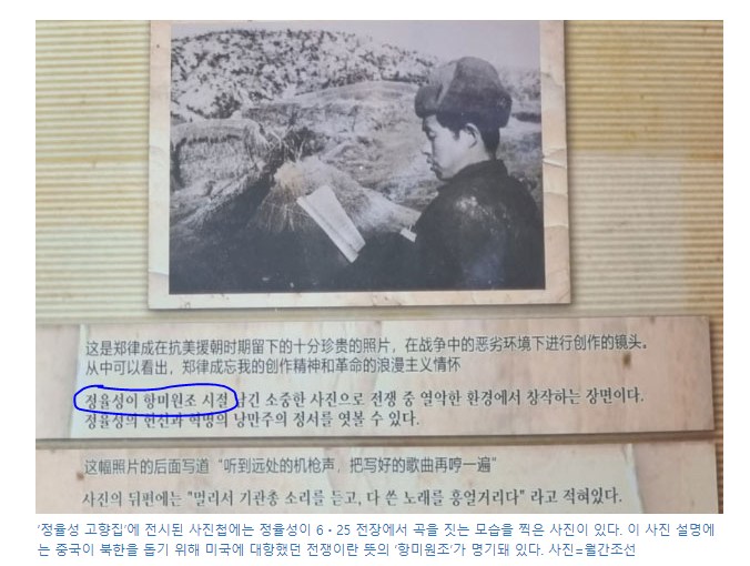 사진 설명란을 보고 여기가 한국인지 중국인지 헷갈린다. 저기서 말하는 ''항미원조"란 6.25당시 우리나라를 불법 침략했던 중공군이 자신들의 참전을 정당화 하기 위해 사용하는 전형적인 선전문구다. 침략국이라고 해도 시원치 않을 판에 "항미원조"라니..이게 지금 말이 되나? 정율성의 헌신과 혁명적 낭만주의?