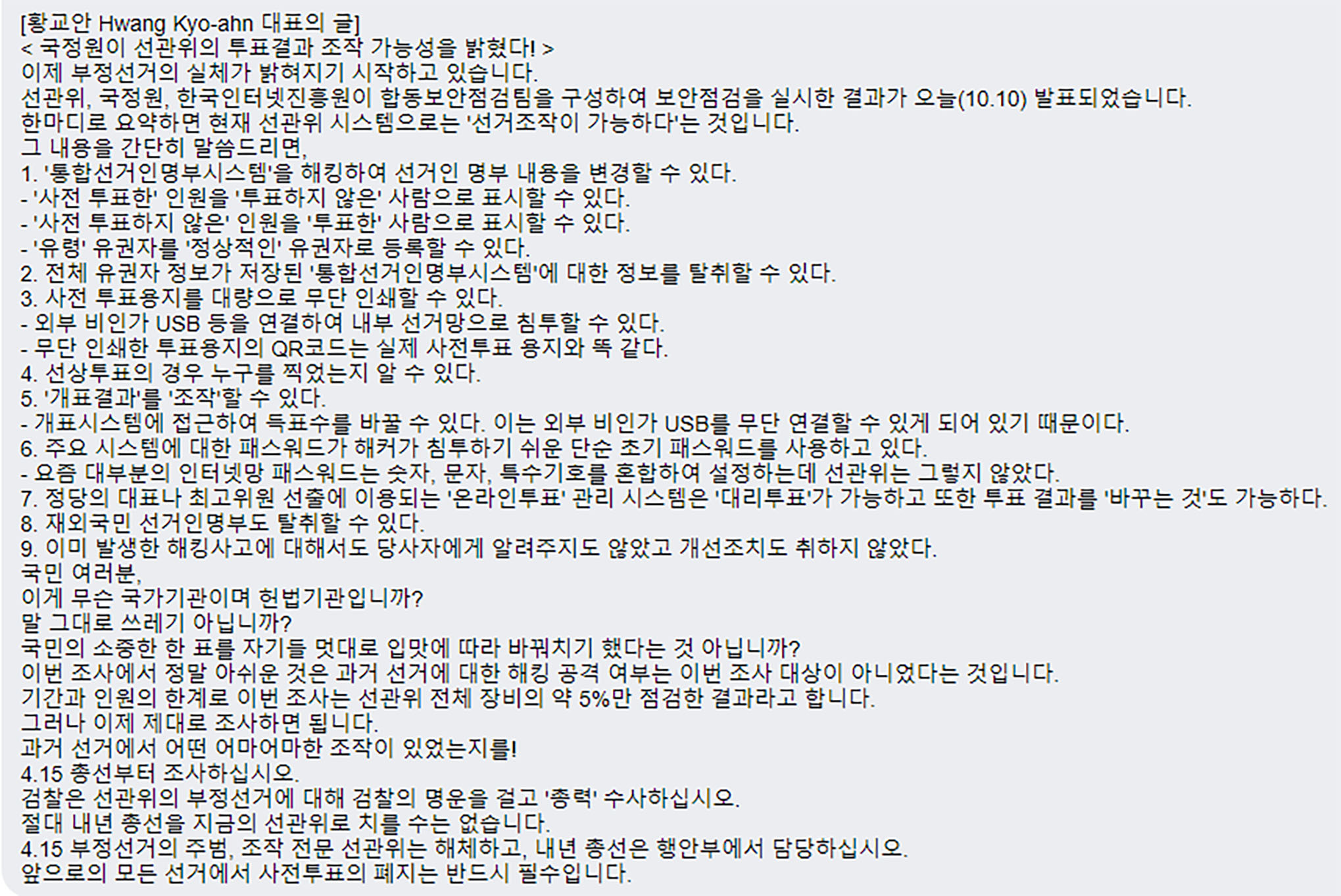 3. 선관위는 또한 "기술적 가능성이 실제 부정선거로 이어지려면 다수의 내부 조력자가 조직적으로 가담해 시스템 관련 정보를 해커에게 제공하고, 위원회 보안 관제 시스템을 불능 상태르 만들어야 하며, 수많은 사람의 눈을 피해 조작한 값에 맞춰 실물 투표지를 바꿔치기해야 하므로 사실상 불가능한 시나리오"라고 발표했다.