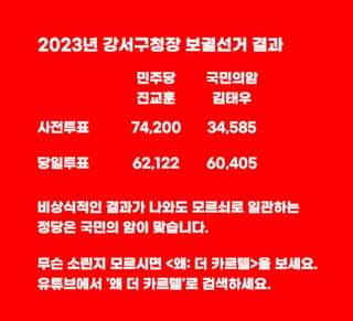 지난 총선 민주당과 국힘의 사전선거 득표율 63대 36의 법칙이 그것이고 10.11 강서구청장보궐선거 사전투표 득표율 민주당 65.48 국힘당 30.54가 투표율 조작의 기막힌 결과다.