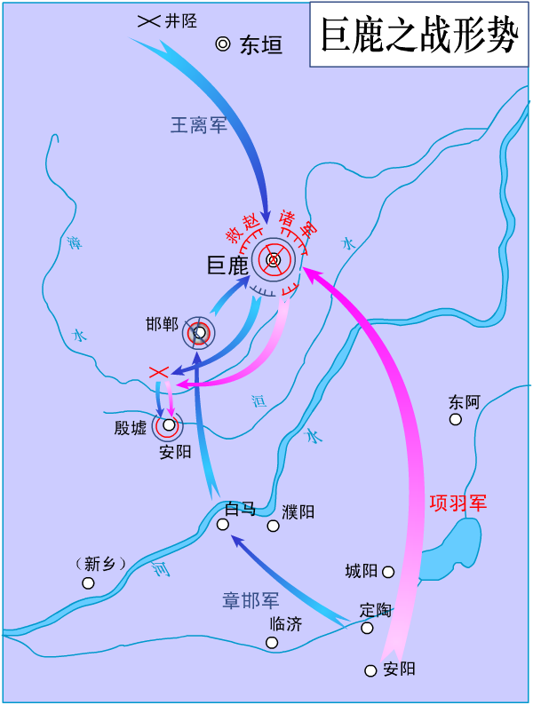 거록성 전투; 장한의 진군은 정도 전투에서 승리 후에, 백마, 한단 거쳐 거록성 포위, 항우군은 안양에서 거록성으로