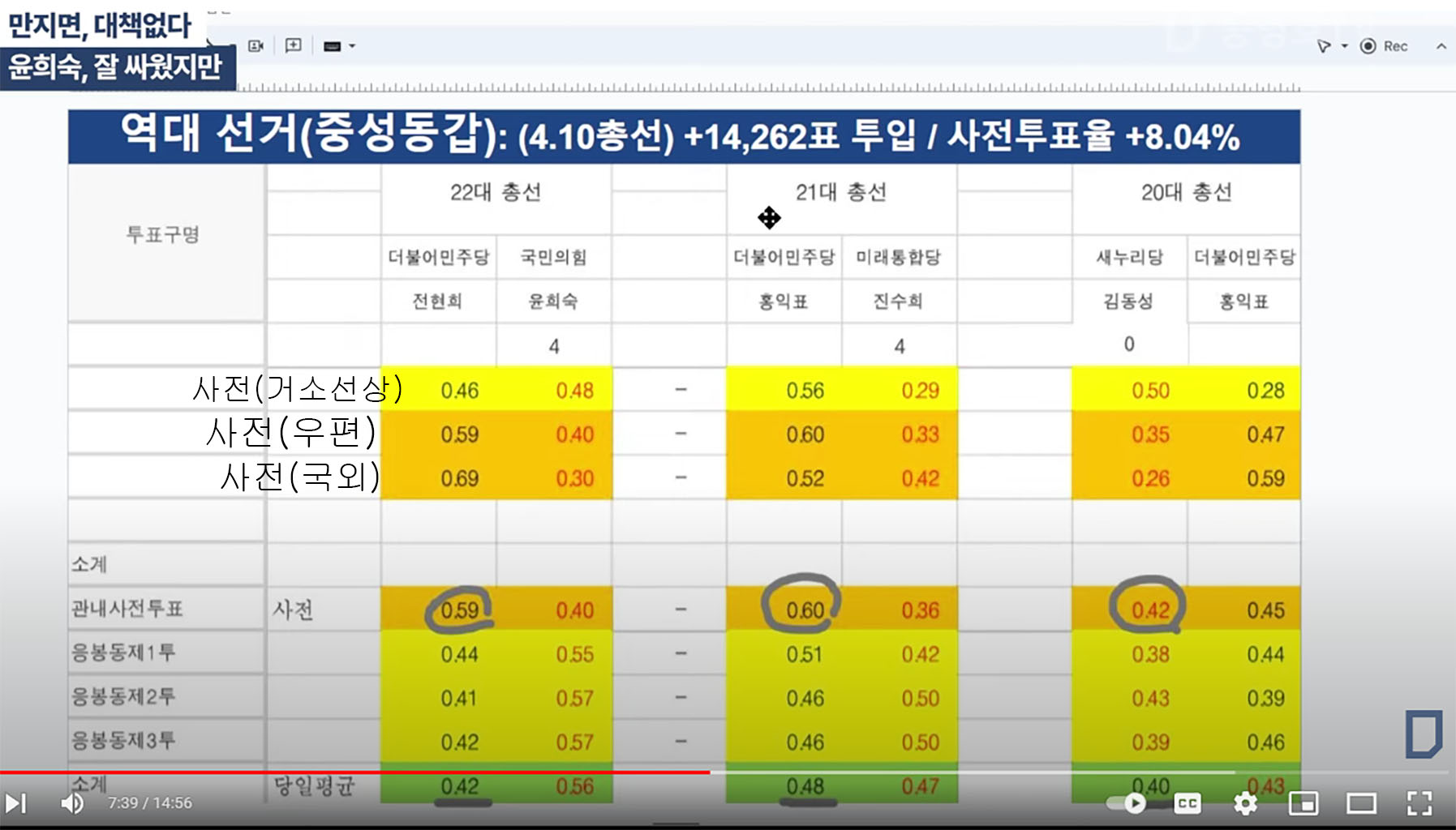 공병호tv에서 ('윤희숙, 항의할까?') 분석한 선관위의 사전 투표 득표율 조작의 한 예: