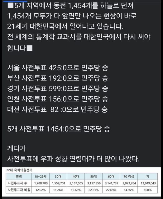 서울 425개 동 전체, 경기 599개 동 전체, 인천 156개 동 전체, 대전 82개 동 전체, 제주 43개 동 전체에서, 민주당이 당일투표보다 사전투표에서 득표율이 훨씬 높게 나왔습니다. 또, 부산, 울산, 세종에서도, 민주당이 후보를 낸 지역은 몽땅 다, 단 한 곳도 빠짐없이 사전투표 득표율이 훨씬 높게 나왔습니다.