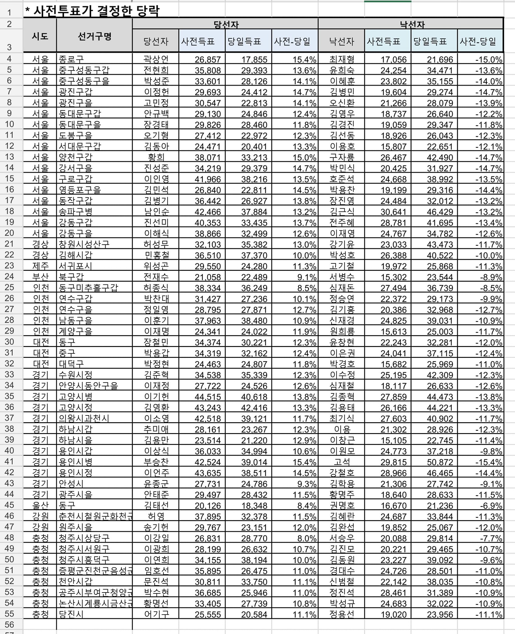 <당일 투표에 이기고도 사전투표로 떨어진 국힘당 후보자 명단>