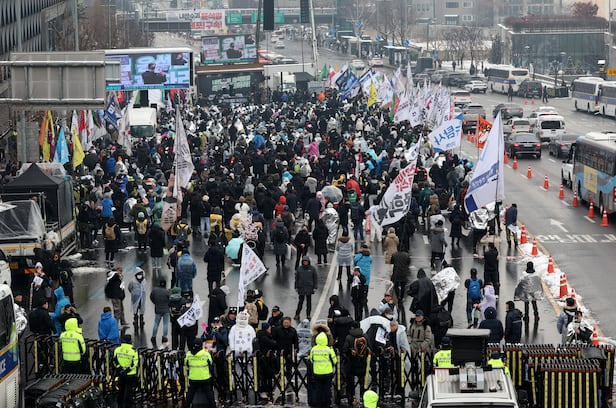 5일 서울 용산구 한남동 대통령 관저 앞 한남대로에서 탄핵 찬성 집회를 벌이고 있는 민주노총 등 반윤(反尹)단체. /뉴시스