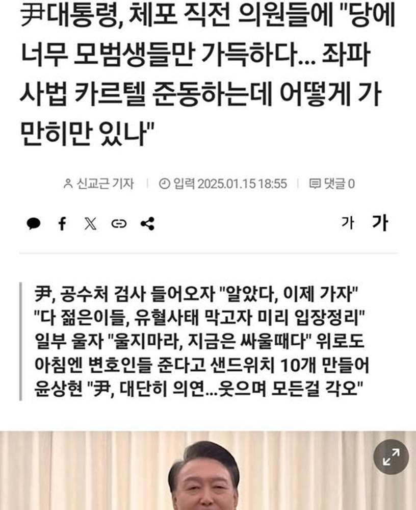 저는 대통령에 출마할 때부터, 우리나라의 대통령이라는 자리가 영광의 길이 아니라 형극의 길이라는 사실을 잘 알고 있었습니다. 하지만, 이 나라의 자유민주주의를 반듯하게 세우고, 자유와 법치를 외면하는 전체주의적 이권 카르텔 세력과 싸워 국민들에게 주권을 찾아드리겠다고 약속한 만큼, 저 개인은 어떻게 되더라도 아무런 후회가 없습니다.