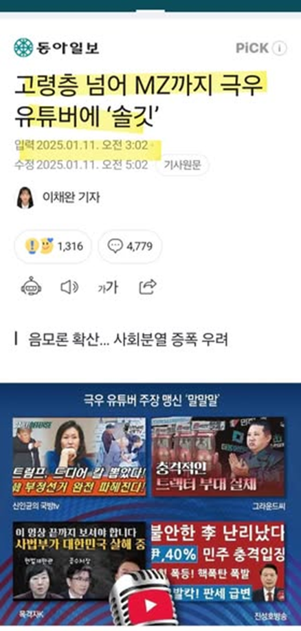 조중동이 간과했던건 우파유투버의 약진이다. 물론 개중엔 생경한 주장도 있지만 조중동의 이런 강아지 풀뜯어먹는 소리 보다는 낫고 또 종편들이 기계적 중립이라고 앉혀놓은 덜 떨어진 좌빨 패널들의 헛소리 안들어서 좋다. 유투브혁명으로 일개 보수 유투버 보다 못한 영향력으로 추락한 소위 레거시언론의 마지막 발악이 정말 추하다.