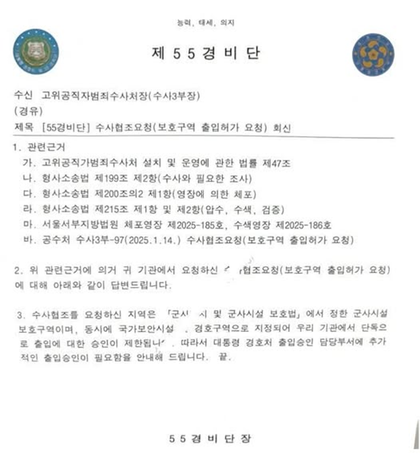공조본의 대국민 사기극과 불법 영장 집행, 이것이 내란이고 쿠데타다! 공수처는 55경비단이 출입을 허가했다고 했으나, 위 공문과 같이 55경비단은 출입을 허가한 사실이 없다.