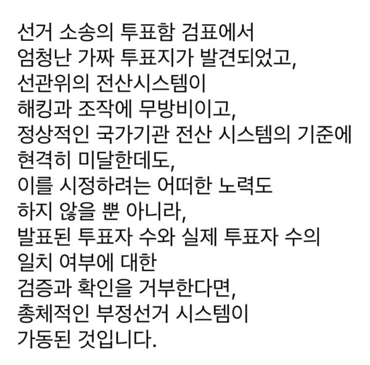 그런데, 대통령이 이미 언급했던 "발표된 투표자 수와 실제 투표자 수의 일치 여부에 대한 검증과 확인을 거부한다면, 총체적인 부정선거 시스템이 가동된 것"이라는 점과, 조대현 변호사가 지적한 "부정선거에 의한 국회 권력 찬탈"이 사실이었음을 반증하는 헌법 재판소의 결정이 나타났다. 그것은 바로 대통령 변호인단에서 요청한 "투표자수 검증 신청"을 기각시켜 버린 일이다. 이제 헌법 재판소 자체도 민주당-선관위 부정 선거 카르텔의 일원임을 스스로 증거한 것에 다름 아니다.