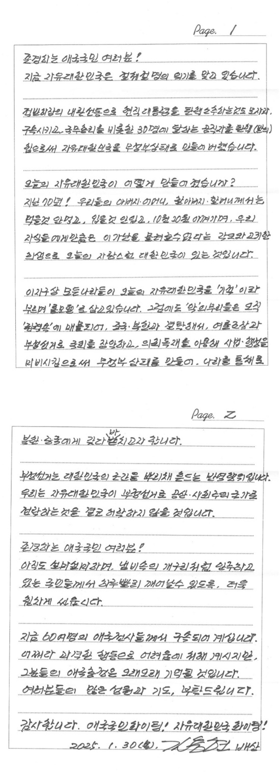 김 전 장관은 ‘1.19 서부지법 사태’로 인해 구속된 60여 명의 시민을 향해서도 안타까운 마음을 금하지 못했다. 그는 “지금 60여 명의 애국 전사들께서 구속되어 계시다”며 “어쩌다 과격한 행동으로 어려움에 처해 계시지만, 그분들의 애국충정은 오래오래 기억될 것”이라고 기렸다. 그러면서 국민을 향해 “여러분들의 많은 성원과 기도 부탁드린다”며 “ 애국국민 파이팅! 자유대한민국 파이팅!”을 외치며 글을 마무리했다.