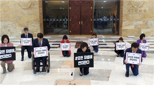 미래통합당 의원들이 10일 국회에서 “모든 차별에 반대한다”며 ‘한쪽 무릎 꿇기’ 퍼포먼스를 해 우파 지지자들의 빈축을 샀다.