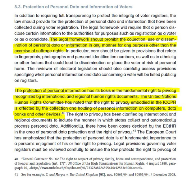UN은 Suffrage Right 참정권을 인간의 보편적인 권리로 간주하고, 이를 침해하는 것을 '반인권 범죄'로 규정하고 UN이 자동으로 안건을 다루게 됩니다. 이 내용은 최원목 교수도 공병호 TV를 통해서 설명을 하셨죠. 그리고 득표 조작과 별도로 선거에서 개인 정보를 불법적으로 수집하여 이용하는 것 역시 UN 인권 협약을 위반하는 범죄입니다.