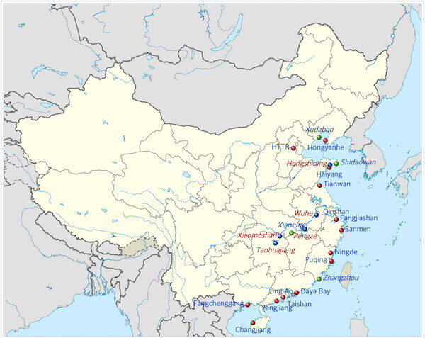 중국 원전 현황(빨강: 가동 중, 초록: 건설 중, 파랑: 예정). 다야 베이(Daya bay)로 표시된 지점이 다야만 원전 위치.