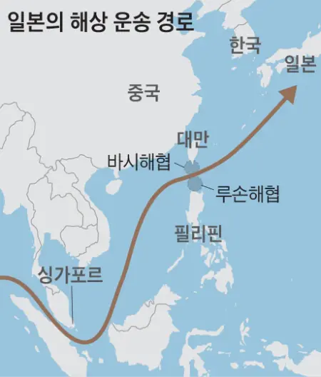 일본은 우리나라처럼 석유와 천연가스 등 에너지 자원을 대부분 해외 수입에 의존하고 있다. 이 에너지 자원의 70~80%가 바로 대만 남부의 바시해협과 루손해협 등지를 경유해 들어온다. 동남아 지역에 진출한 일본 기업 공장에서 생산된 부품도 이 경로를 통해 본토로 수입된다.