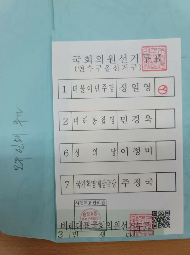 ● 사전 투표 용지 ● 사전 투표소에서 투표용지발급기(TM-C3400 엡손 프린터)로 바로 현장 발급 투표용지에 QR코드가 있는 것이 사전 투표지