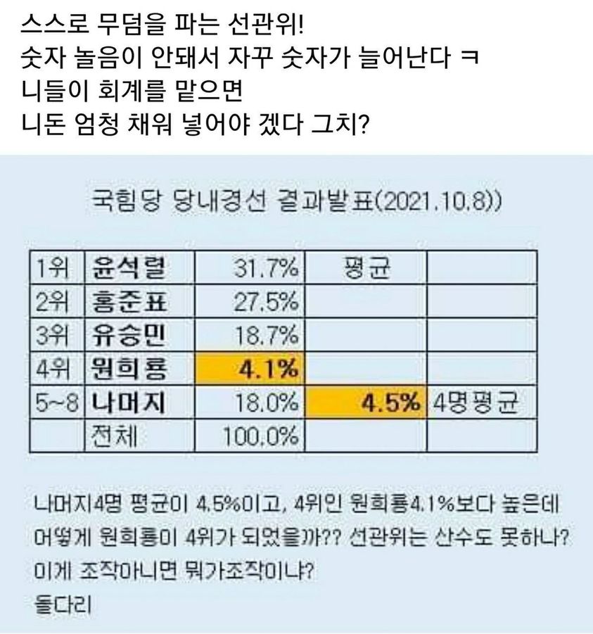 그것은 지난 총선 부정선거의 피의자로 재판 중에 있는 중앙 선관위가 국힘당 대표 경선을 주장하였기 때문이다. 자기를 정면 공격하는 황교안을 퇴출시키고 부정선거를 부정하는 사람을 4강의 마지막 후보로 올려 두어야 할 절체정멸의 위기의식 속에서 중앙 선관위가 자신이 가진 모든 데이터를 동원하고 기술을 발휘하여 자신들의 대적 황교안을 내동댕이 쳐 충격사를 도모한 것이다. "중앙선관위는 여론조사 회사와 통신회사 장악으로 뭐든지 할 수 있다. 이제 이들 저주받은 검은 세력에게 남은 것은 여론조작과 부정선거로 이재명을 당선시키는 것뿐이다."