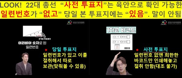 유권자 여러분, 이번 4.10 총선 부정선거의 핵심은 사전투표입니다. 그런데 선관위가 이제까지 사전 투표자수를 눈으로 보고 직접 세어볼 비교 대상을 모두 없애버렸다는 점이 큰 문제입니다. 유권자 여러분들의 사전 투표지 바코드 번호 누락 관련 고견을 듣고 싶습니다.
