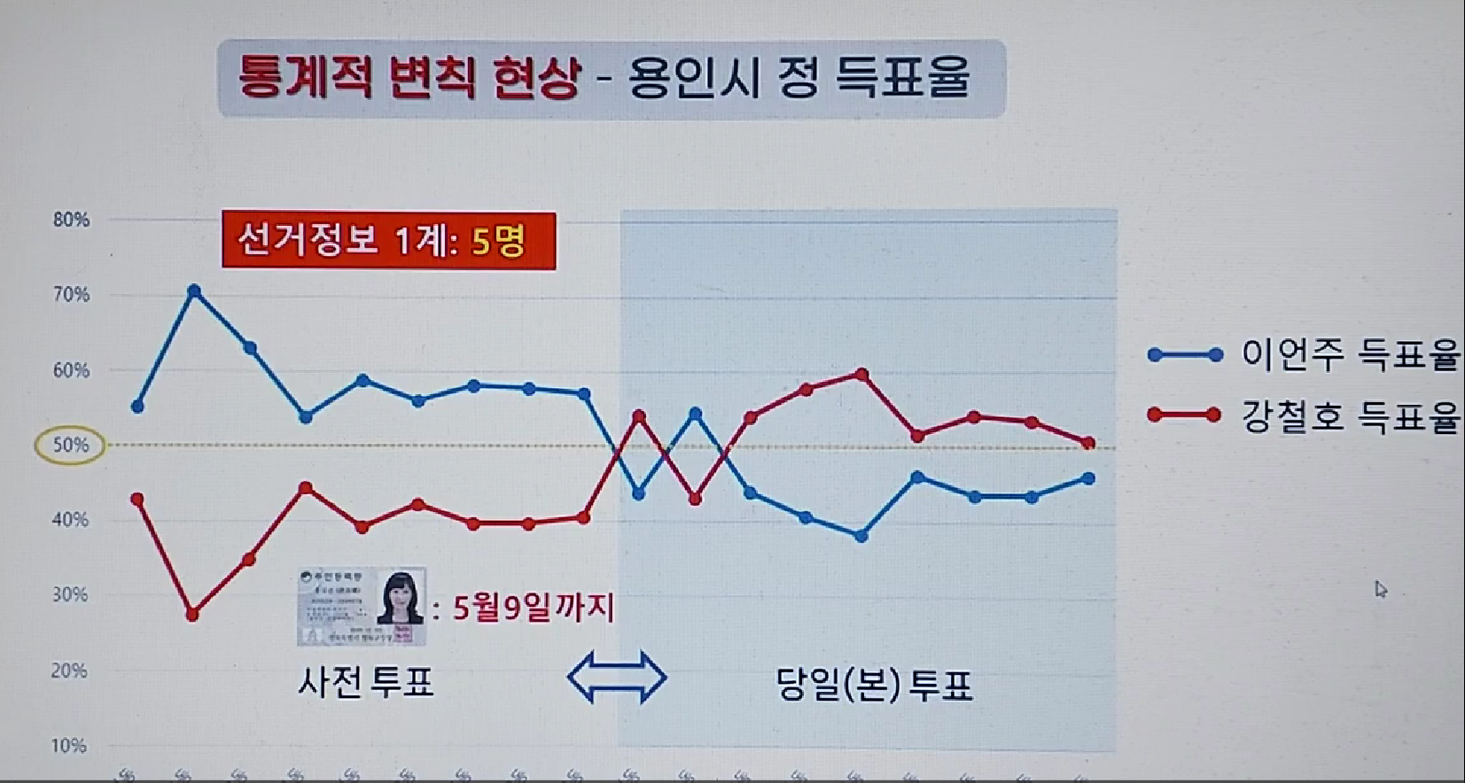 그런데 선거 결과 통계 수치를 보면, 사전 투표 득표율에서 경기 인천 서울 수도권 지역 전체에서 민주당이 63%, 미래 통합당이 36%란 고정 수치를 보였다. 예외가 없이 전체 수도권 지역에서 상황이 이러했던 것이다. 그래서 통계학 전문가들 중에 명지대 통계 물리학과 박영아 교수는 이런 결과치는 동전 1000개를 던져 모두가 한 면이 나올 확률과 같다고 (현실 세계에서 불가능한 확율) 사전 선거 득표율 조작을 주장하였다. 다시 말하면, 조립되지 않은 시계 부속품들을 가방에 넣고 1분간 흔들었더니 정상적으로 작동하는 시계가 나와야 하는 확률이라 한다. 인간 세상에서 전혀 불가능한 일들이다.