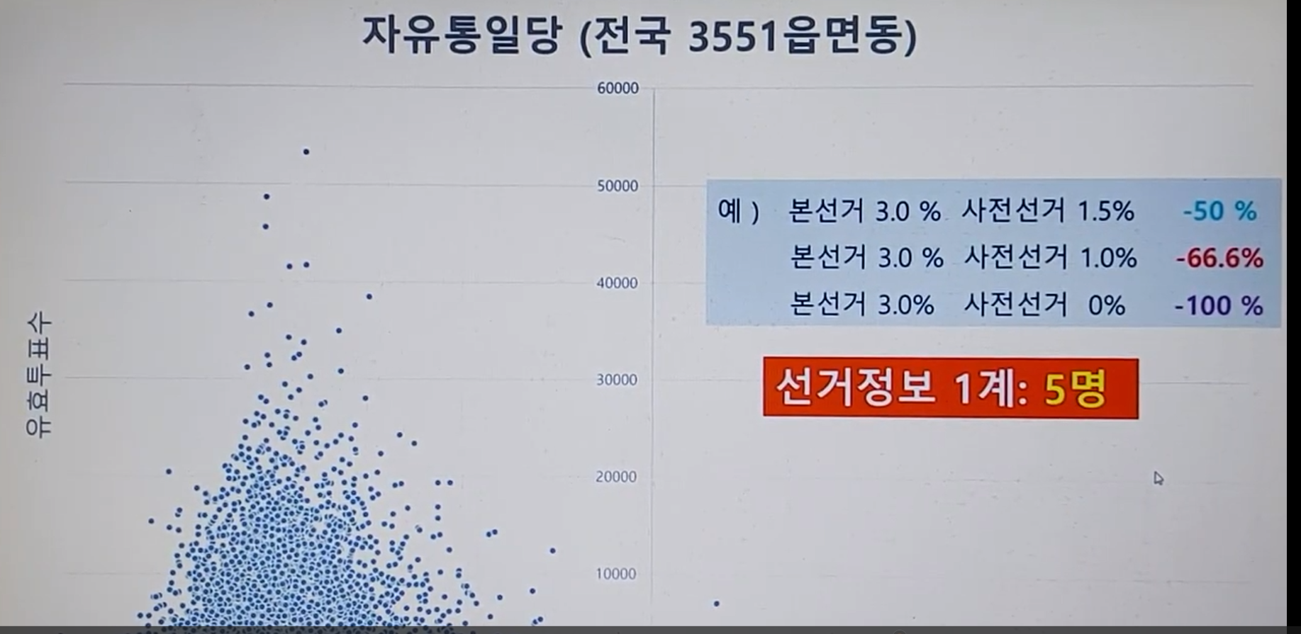 이 분야에 일가견을 가진 재야 전문가들이 연구한 바로는 수도권에서는 미래 통합당 3표당 1표를 도적질해서 민주당에 주는 식으로 전산 조작을 (프로그램을 통해) 했고, 종로구는 2표당 1표를 도적질, 부산 충남은 4표당 1표를 도적질, 대구는 6표당 1표, 경남은 5표당 1표를 도적질했다. 이런 보정값을 통해 정상 결과치를 얻을 수 있다. 2016년 사전투표와 당일 투표 간의 여야 지지율이 0.1-0.3, 05% 정도의 근소한 차이였다면 (정상), 2020년 총선에서는 민주당이 13%, 미래 통합당이 -13%를 전국적으로 기록했다. 조작이 필요없는 전라도를 제하고 모든 선거구에서 이런 이상한 수치가 등장한 것이다.