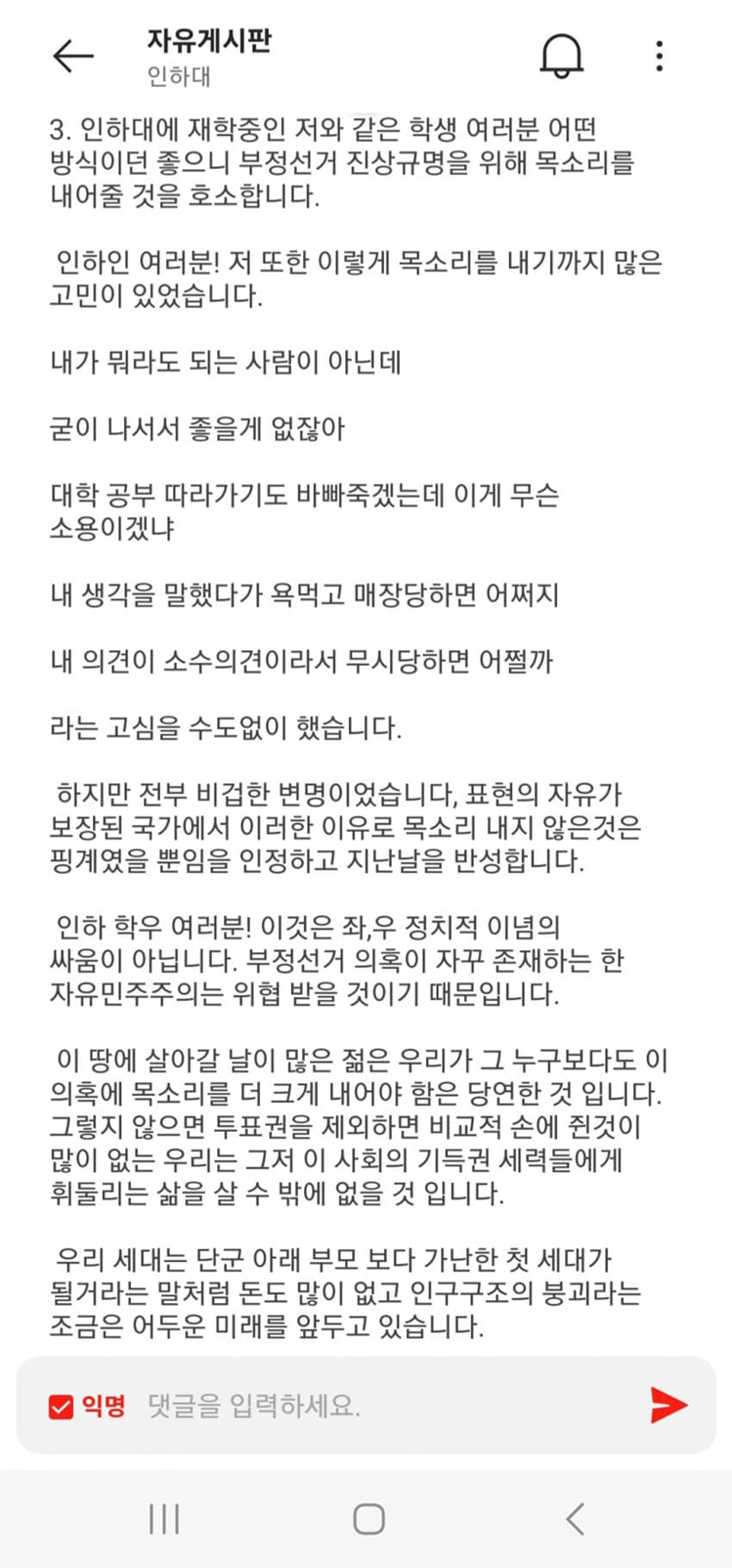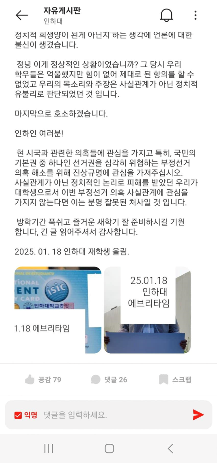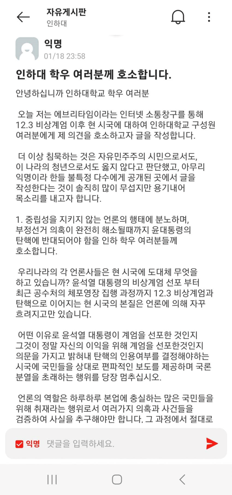 예언과 시사 인하대 학우 여러분! 중일사랑 2025. 1. 20. 12:36 광주 출신 20대 여청년의 시각 변화 뼈속까지 민주당인 전라도 20대 여자가, 계엄으로 윤석열을 지지하게 된 이유 [인하대 학우들이여!]