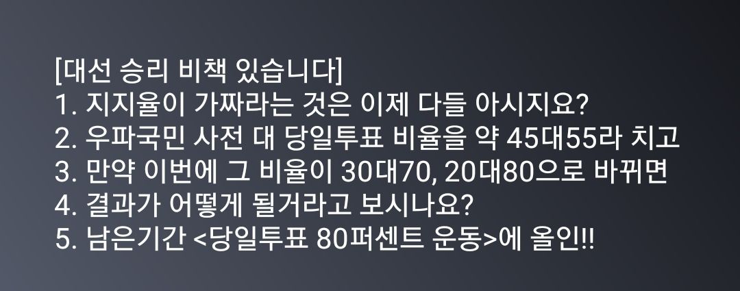 부정선거만 막을 대비책을 세우면 김문수후보의 당선은 담보된다. 선관위에 사전투표지 투표관리관 인장 날인을 인쇄가 아닌 현장 날인으로 바꾸고 전자개표기 사용을 금하는 조치를 관철해야 한다.